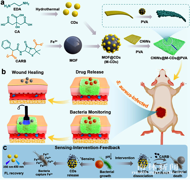 【南林新闻中心讯】近日,林产化学与材料国际创新高地木质纤维素功能材料团队在国际材料领域知名期刊《Advanced Functional Materials》(影响因子19.0)在线发表了题为“Closed‐Loop Responsive Smart Bandages for Dynamic Monitoring and Self‐Regulated Antibacterial Therapy in Wound Healing”的研究论文(论文链接:https://doi.org/10.1002/adfm.202520327)。我校为第一完成单位,喻照川博士为论文第一作者。该研究工作得到了国家自然科学基金、江苏省自然科学基金等项目的资助。