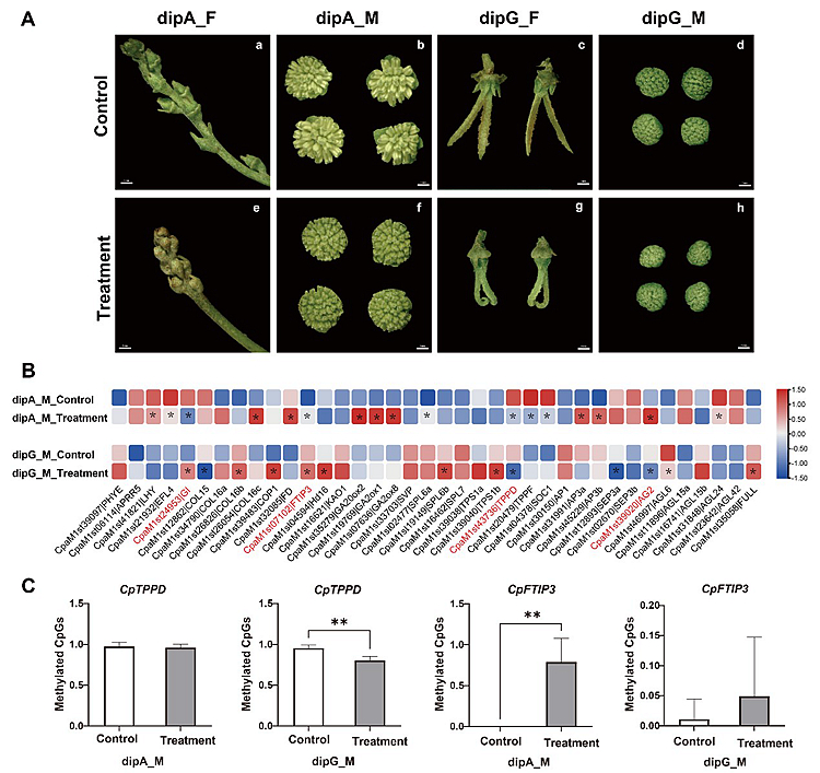 青钱柳为我国特有的单种属植物,是集药用、保健、材用和观赏等多种价值于一身的珍贵多功能树种。该研究首次应用全基因组重亚硫酸盐测序技术(WGBS)构建了二倍体青钱柳两种交配类型雌雄花的单碱基分辨率DNA甲基化图谱,发现同一交配类型中先行花(dipA_M和dipG_F)的DNA甲基化水平(尤其在CHH序列环境中)整体高于后续花(dipA_F和dipG_M)。基于DNA甲基化组和转录组联合分析,获得了涉及海藻糖-6-磷酸信号等途径的38个甲基化差异表达基因,其中TPPs基因家族在胡桃科胡桃属和枫杨属植物中均被认为是雌雄异型异熟性状的关键遗传位点。通过异源过表达及甲基化抑制剂5-氮杂胞苷(5-azaC)田间处理进行双重验证发现, CpHd16、CpTPPD和CpFTIP3基因的过表达均推迟了拟南芥的花期(图1),而5-azaC处理不仅延缓了青钱柳雌雄花的发育进程,还改变了CpTPPD和CpFTIP3的甲基化状态与表达水平(图2),推测这些基因可能通过甲基化调控介导了青钱柳的开花过程。研究结果揭示了DNA甲基化在青钱柳雌雄异熟形成中的潜在作用,对解析植物交配系统的起源和演化具有深远意义。
