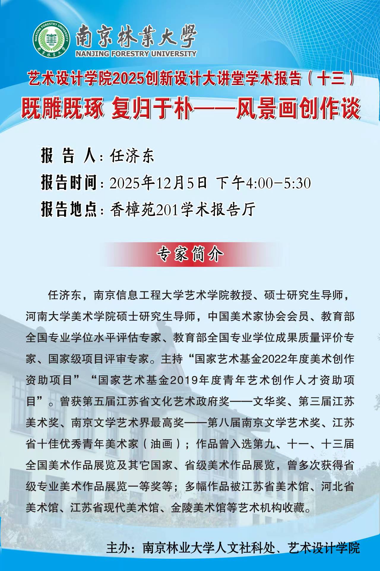 活动预告 首页 -活动预告 既雕既琢 复归于朴--风景画创作谈 来源:通讯员:摄影:【报告人】任济东 【报告时间】2025年12月5日 下午4:00-5:30 【报告地点】香樟苑201学术报告厅编辑:浏览:时间:2025-12-02 字号:【大中小】