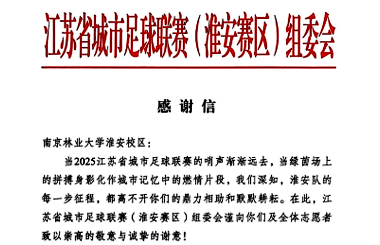 【南林新闻中心讯】12月15日,江苏省城市足球联赛(淮安赛区)组委会向我校淮安校区发来感谢信,对学校在赛事期间提供的全方位志愿服务致以诚挚谢意。